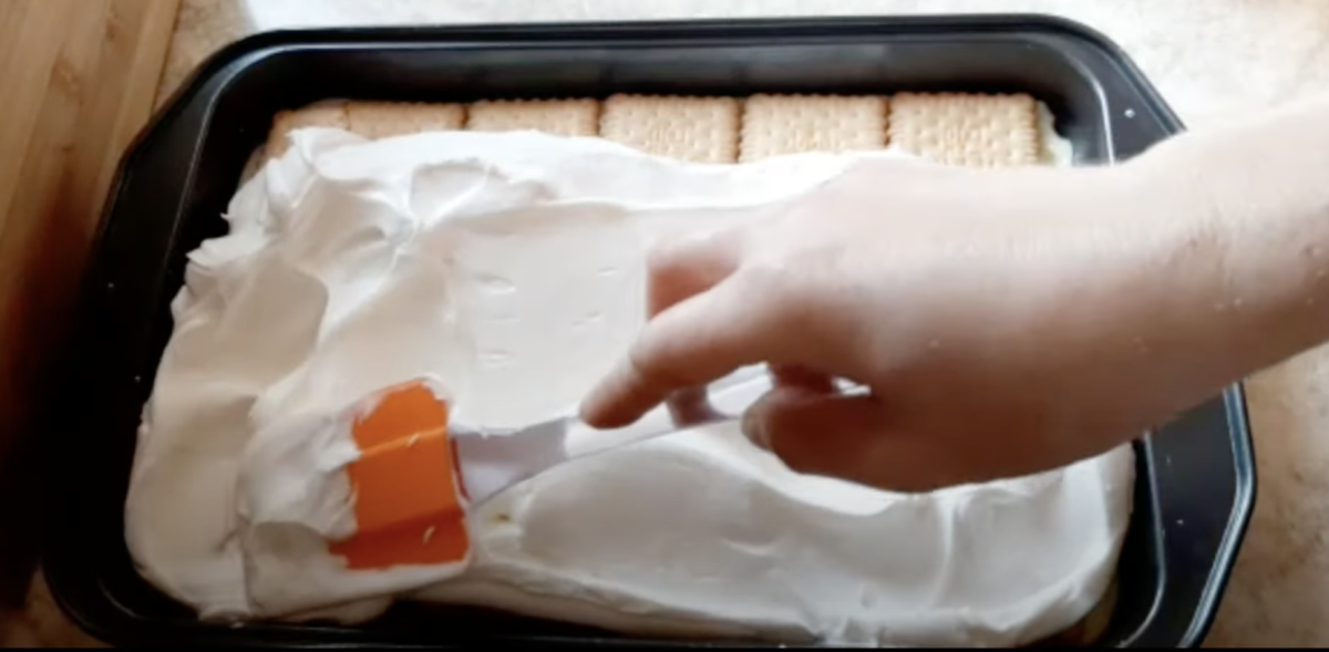 Wlej masę twarogową na ciastka i wygładź powierzchnie, ponownie ułóż herbatniki i skrop mlekiem. Posmaruj bitą śmietaną i wstaw do lodówki.