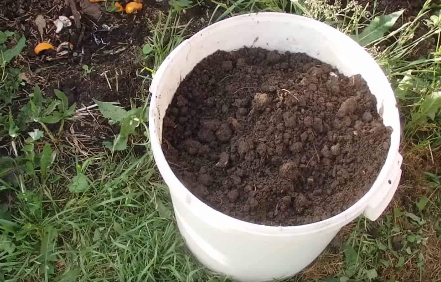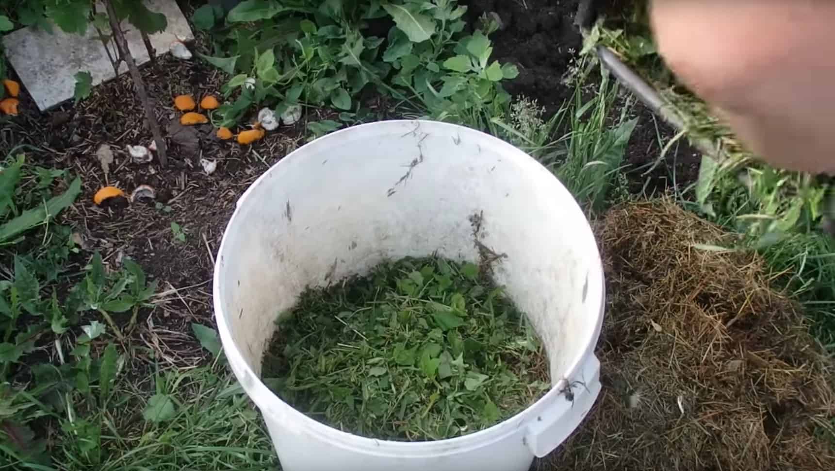 Następnie na dnie donicy lub wiadra należy ułożyć skoszoną trawę do około 3/4 wysokość pojemnika. W następnej kolejności całość trawy należy przykryć ziemią, ale tak aby w wiaderku pozostało jeszcze wolne miejsce. Ciężar ziemi ubije suchą trawę.