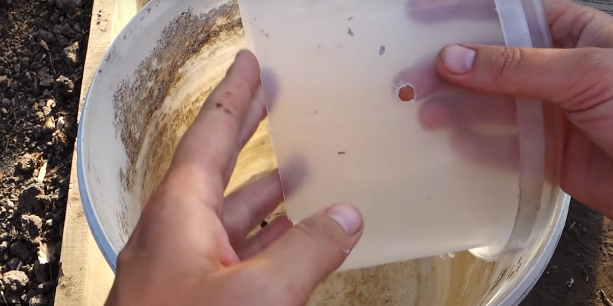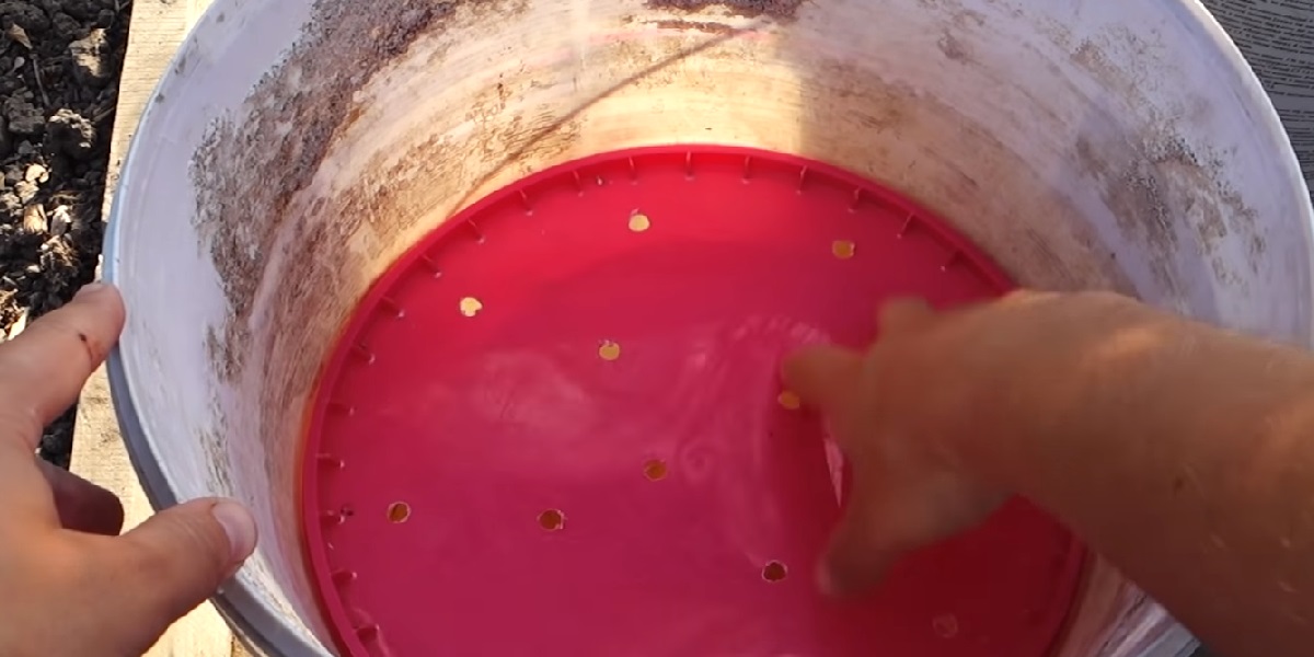 W plastikowej osłonie z dziesięciolitrowego wiadra wykonaj 13–15 otworów wiertłem nr 8 lub nr 10. Średnica pokrywy powinna być takiej wielkości, aby spoczywała stabilnie na małym wiadrze.