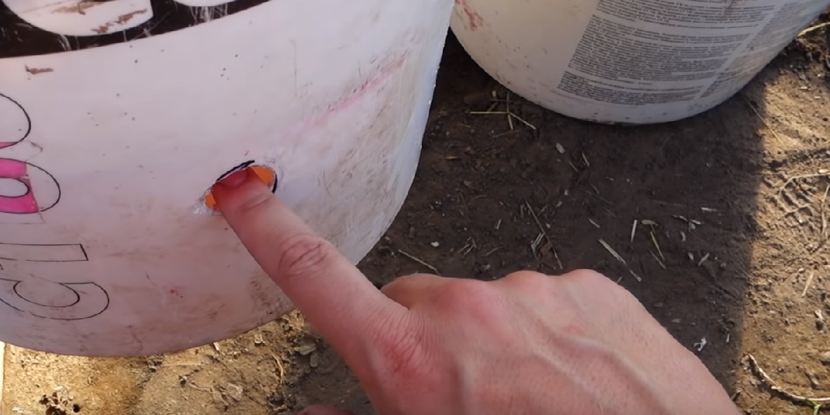Nieco poniżej poziomu, na którym znajduje się pokrywa, wykonaj otwór. Jego średnica powinna odpowiadać szerokości szyjki plastikowej butelki. Możesz też zrobić otwór na zwykłą konewkę.