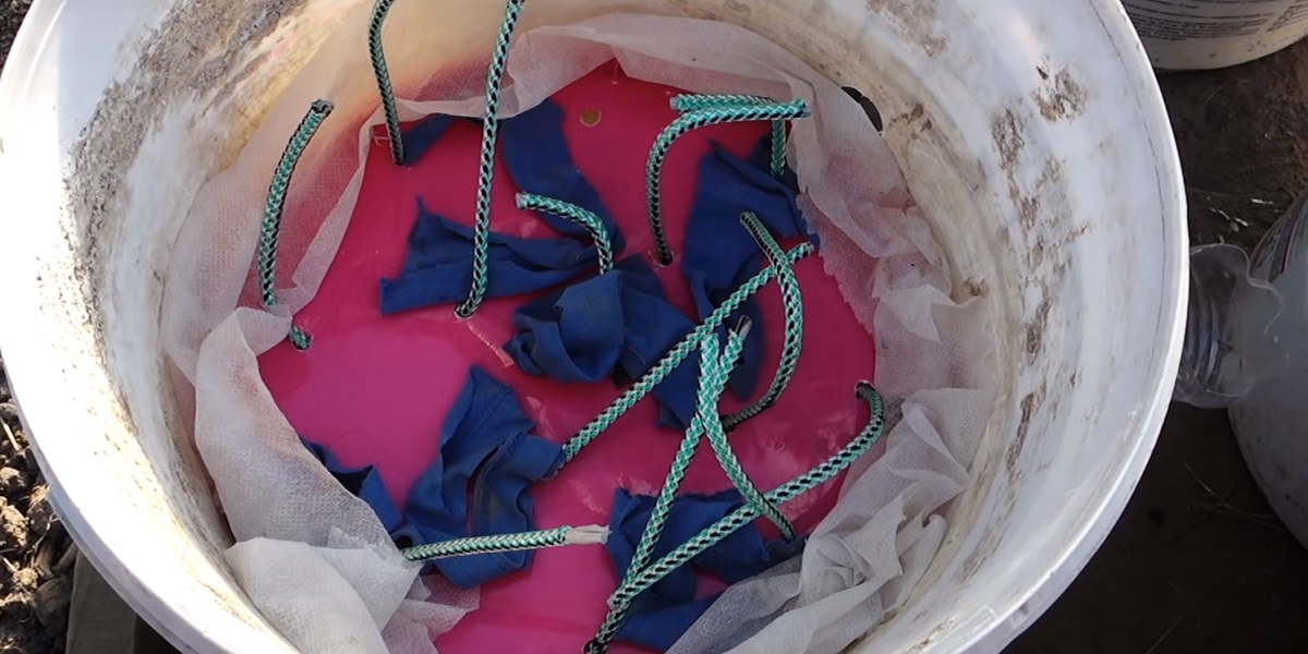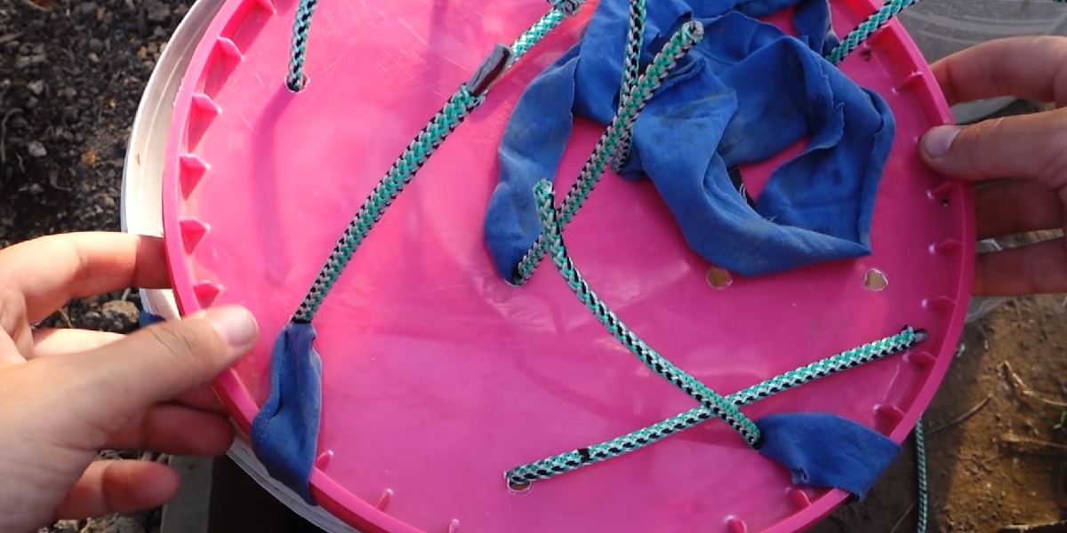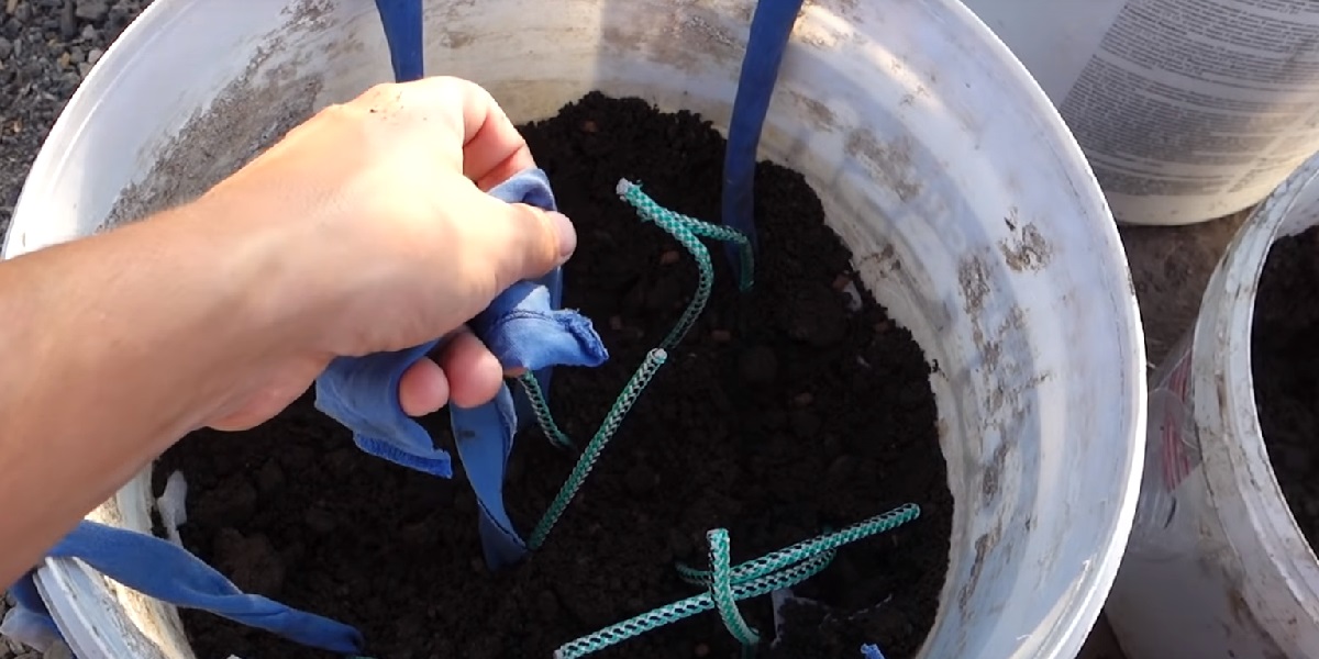 Napełnij wiadro ziemią. W przypadku ogórków możesz wziąć zwykłą ziemię z ogrodu, dodać 100 g popiołu i 500 ml obornika, wszystko dobrze wymieszaj. Lub kup gotowy grunt w sklepie. Zasypując trzymaj liny pionowo.