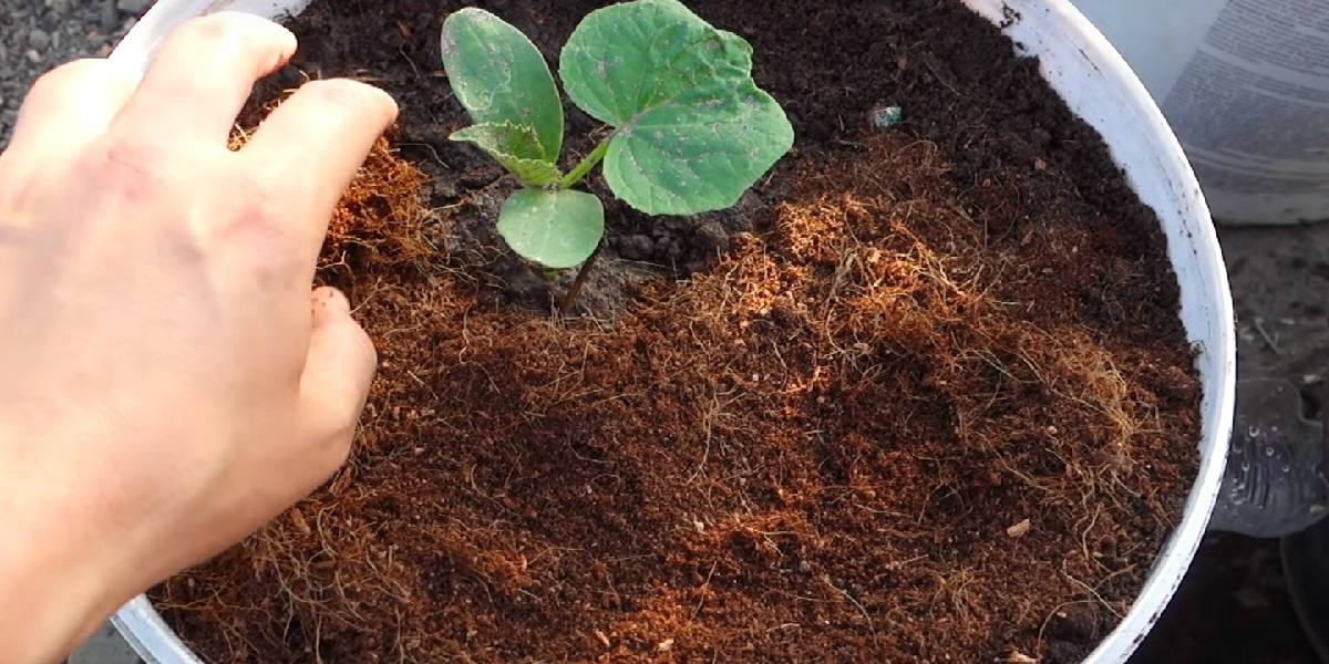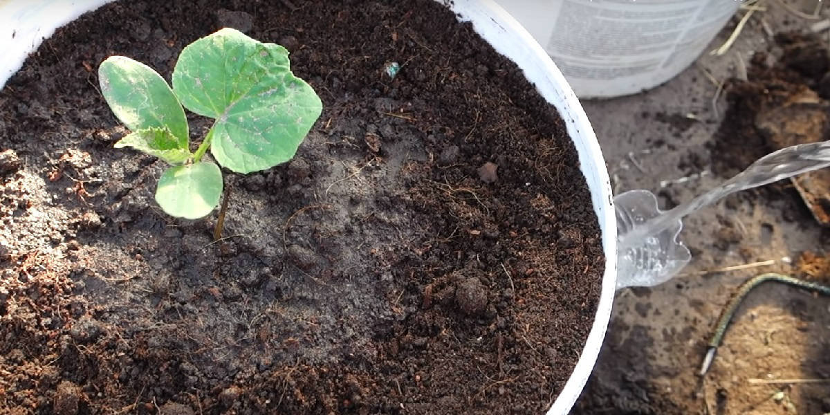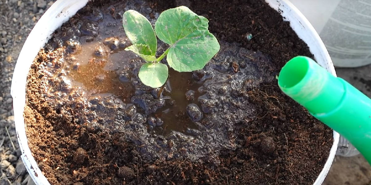 Po środku wiadra wsadź sadzonkę. To samo możesz zrobić z nasionami. Jeśli ziemia była sucha, dobrze ją podlej. W przyszłości podlewanie nie jest wymagane: roślina otrzyma wilgoć od dołu. Napełnij dno wiadra wodą przez butelkę.