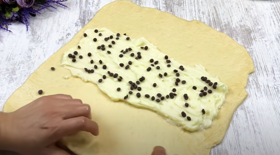 Do drożdży dodaj 1 jajko, 3 łyżki ciepłego masła, 1/2 łyżeczki soli i wanilinę. Dobrze wymieszaj. Stopniowo dodawaj 300 g mąki, mieszając, aż ciasto będzie gładkie. Jeśli ciasto jest zbyt klejące, dodaj trochę więcej mąki. Nasmaruj miskę olejem roślinnym, włóż do niej ciasto, przykryj i odstaw w ciepłe miejsce na 1-2 godziny, aż ciasto podwoi swoją objętość. Gdy ciasto wyrośnie, podziel je na 2 części. Rozwałkuj każdą część na prostokąt.