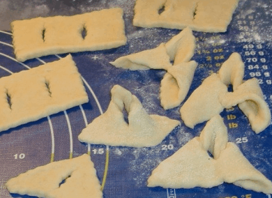 Rozwałkuj i pokrój w prostokąty. W każdym z nich zrób dziurkę pośrodku, a następnie przewlecz przez nią jeden koniec, tworząc charakterystyczny kształt.