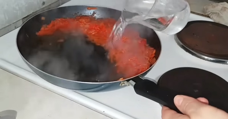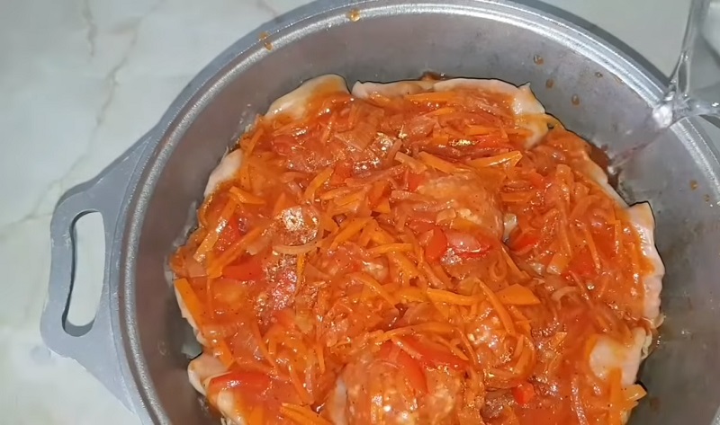 Przygotować duży garnek. Wlać małą ilość wody, ułożyć warstwę gołąbków i polać ją sosem. Naprzemiennie układać warstwy sosu i gołąbków. Na koniec wlać pozostały sos i 0,5 l wody. Gotować na wolnym ogniu.
