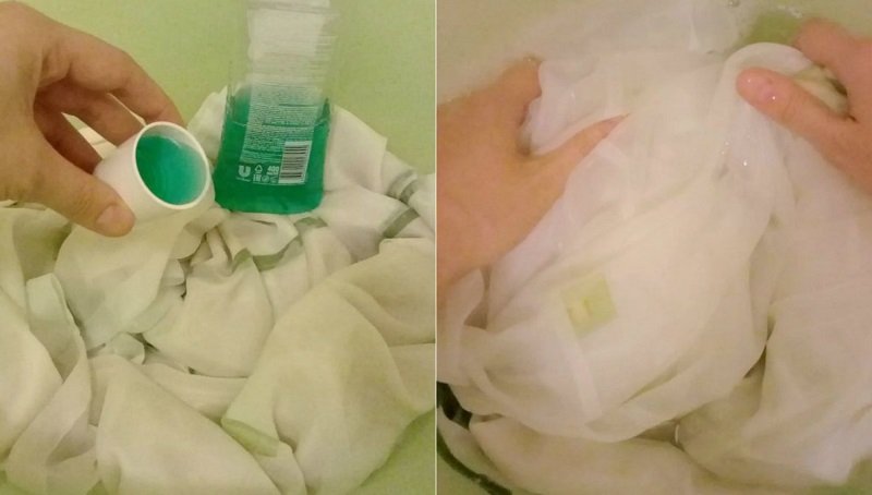 Po tym czasie przepierz delikatnie firanki w misce z roztworem płynu. Firanki odciśnij delikatnie z nadmiaru wody i włóż je do pralki.