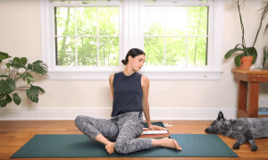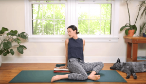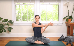 Następne ćwiczenie zacznij od położenia dłoni na kolanach. Następnie wytrzyj kręgosłup i podciągnij podbródek. Wraz z wydechem opuszczaj głowę i przyciągaj podbródek do klatki piersiowej. Czynność tę wykonaj kilka razy, jednak przy ostatnim powtórzeniu wyciągnij ramiona do przodu, a podbródek przyciągnij do klatki piersiowej, tak by plecy były zaokrąglone.
