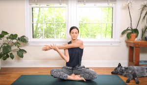 Z takiej pozycji zacznij następne ćwiczenie, które polega na zwinięciu pleców do góry i rozciągnięciu się do najwyższego punktu na głowie. Następnie podnieś dłonie na kolanach i odsuń swoje łokcie maksymalnie do tyłu. W takiej pozycji klatka piersiowa jest wyłączona, a ty możesz delikatnie kilka razy pulsować tam i z powrotem rękami.