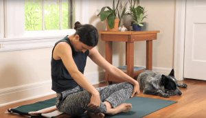 Teraz zgięte w kolanach nogi odegnij na bok w taki sposób, by kolanami nie dotykać podłogi. Głowę odwróć w przeciwną stronę co kolana i oddychał głęboko. Czynność tę powtórz kilka razy, zmieniając strony odginania nóg.