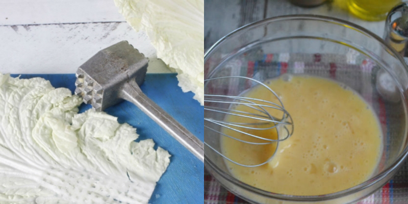 1. Oddziel liście kapusty od łodygi. Usuń najtwardszą część podstawy, rozbij liście za pomocą tłuczka kuchennego. Wymieszaj jajka z solą i pieprzem. Dodaj mąkę, wymieszaj na gładką masę.