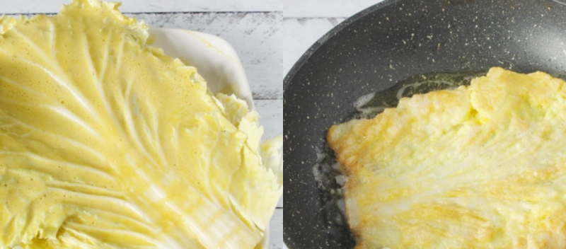2. Każdy liść kapusty zanurz w cieście i smaż na oleju słonecznikowym przez minutę po obu stronach. Kładź je na papierowy ręcznik, aby wchłonął nadmiar tłuszczu.