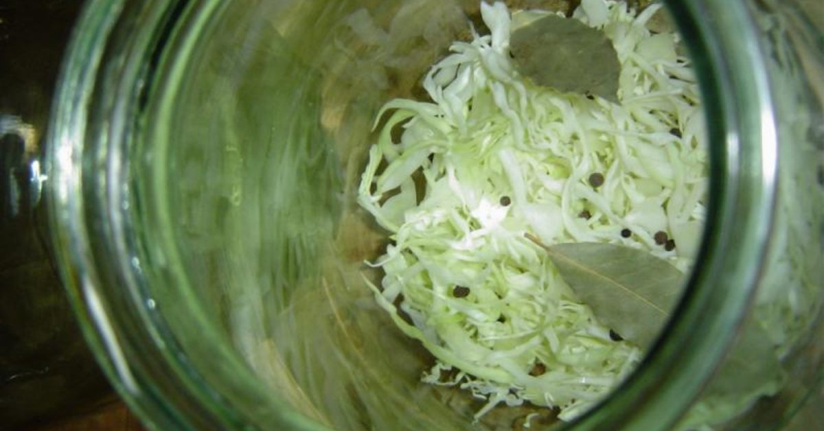 Posiekaj kapustę, umyj pomidory i odstaw na kilka minut. Umieść warstwę kapusty, 2 liście laurowe i kilka ziarenek pieprzu na dnie wysterylizowanego słoika.