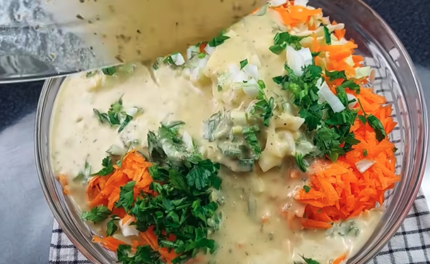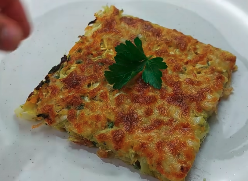 Dobrze umyj kapustę wodą z octem i pokrój na bardzo drobne kawałki. Obierz i zetrzyj marchewki. Pokrój cebulę na bardzo cienkie plasterki. Posiekaj kilka gałązek pietruszki. W dużej misce wymieszaj 4 duże jajka, 1/4 szklanki mleka, 1 łyżeczkę soli, 1/2 łyżeczki czarnego pieprzu, 1 łyżeczkę oregano, 1 łyżeczkę proszku do pieczenia, 4 łyżki mąki i 2 łyżki oliwy z oliwek. Dobrze wymieszaj.