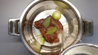 Mięso przełożyć do garnka, dodać liść laurowy, nowe przyprawy, łyżeczkę soli oraz oczyszczoną i posiekaną cebulę. Następnie zalać wrzątkiem wołowinę i gotować 90-150 minut.