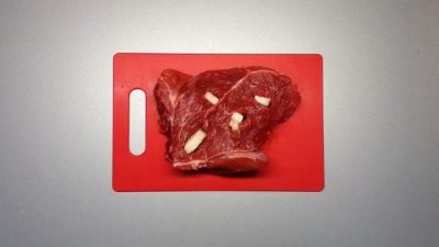 Mięso oczyść, długim i wąskim nożem wykonaj głębokie nacięcia w mięsie, a następnie włóż pokrojony w frytki wędzony boczek.