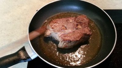 Dokładnie posolić i pieprzyć wołowinę. Na patelnię wlej odrobinę oleju i poczekaj, aż się rozgrzeje. Następnie obsmaż na nim mięso tak, aby zarumieniło się ze wszystkich stron.