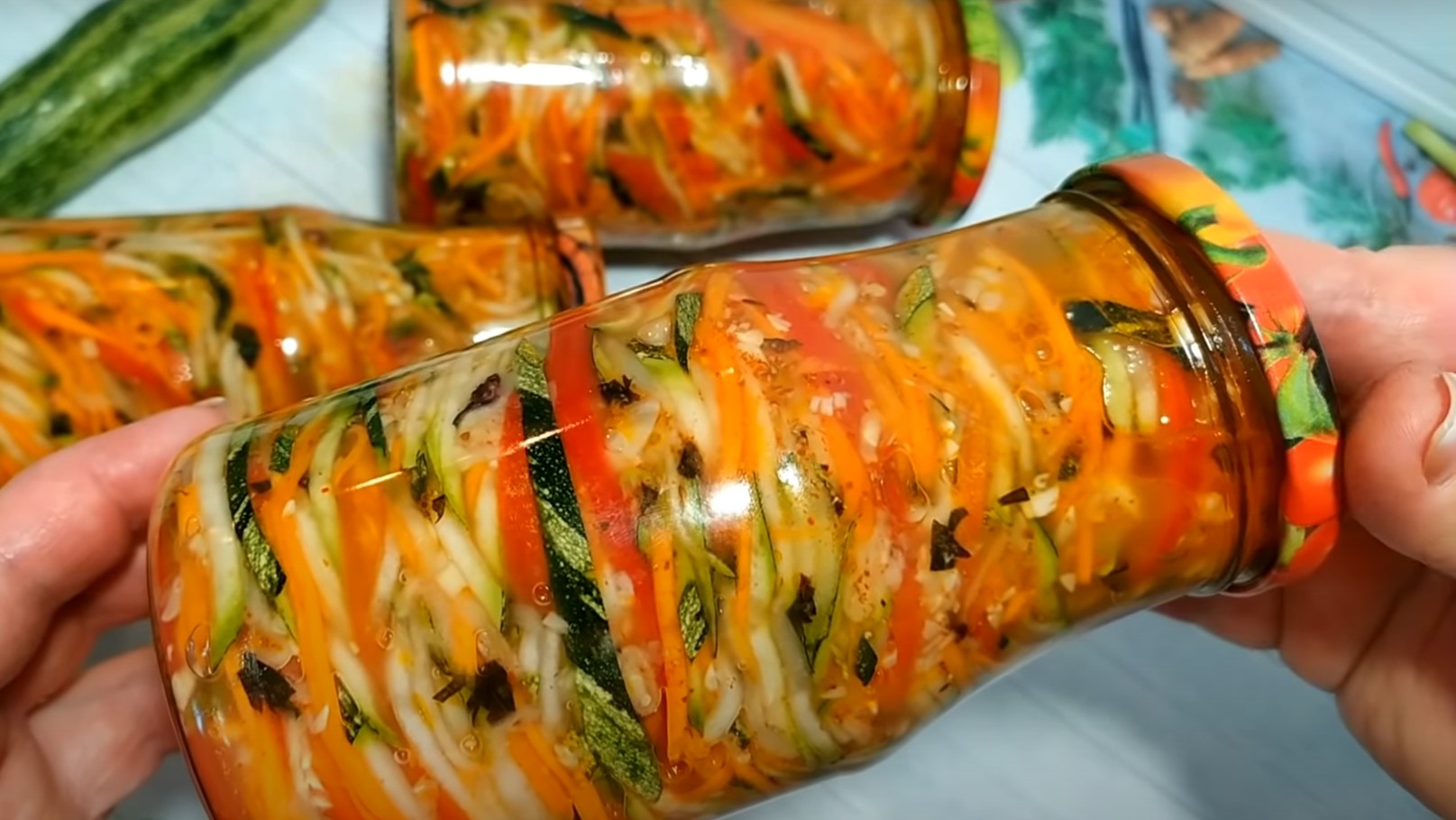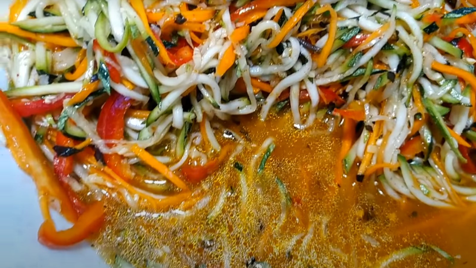 Aromatyczna cukinia po koreańsku z czerwoną papryką i marchewką.  Przepis.