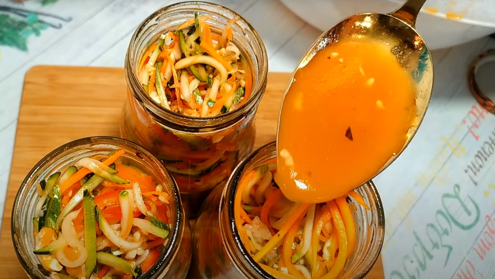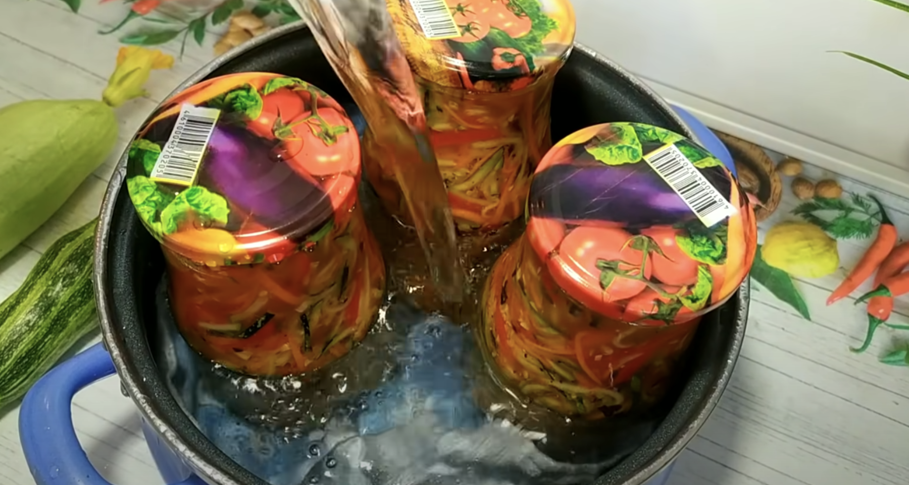 Marynowane warzywa będą tworzyć sok. Przełóż warzywa do słoików. Następnie sok wlać do słoików. Słoiki należy zagotować w dużym rondlu z pokrywką na dnie.