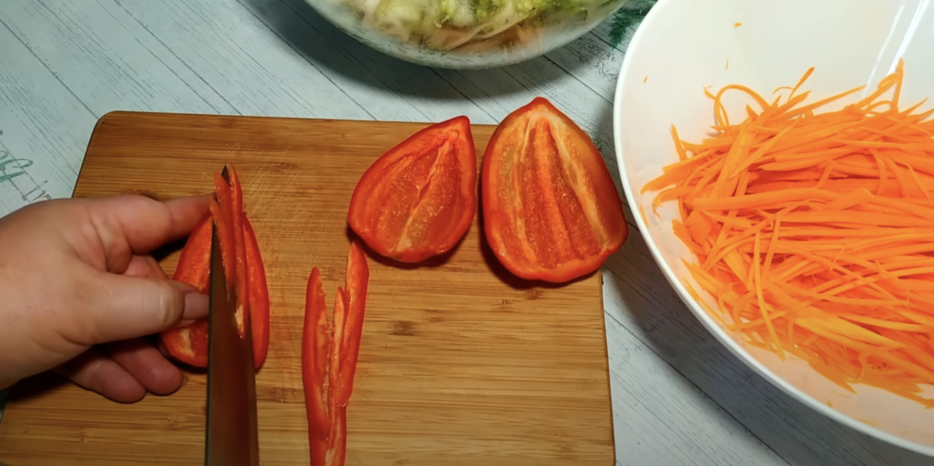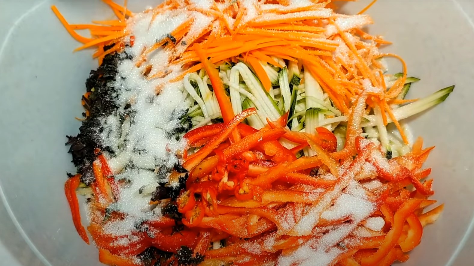 Paprykę można pokroić w paski. Wszystkie warzywa umieścić w misce i dodać cukier. Wymieszać z przyprawami (tj. Dodać przyprawy, kolendrę, mielony pieprz i sól). Można uczynić go bardziej aromatycznym, dodając ocet i ostrą paprykę.