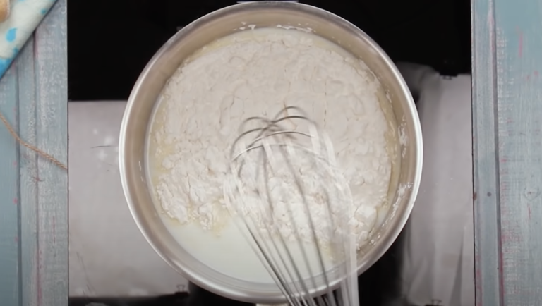Następnie w osobnym naczyniu mieszamy mąkę ziemniaczaną oraz cukier i dodajemy do nich pół szklanki mleka.