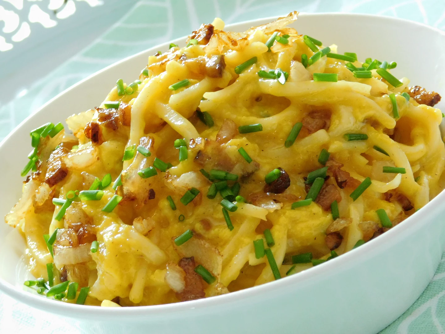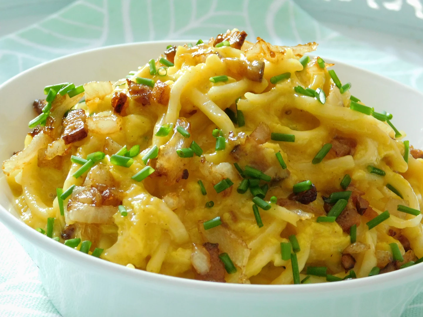 Dodać makaron i wymieszać. Podawaj od razu, posypane boczkiem i cebulą.