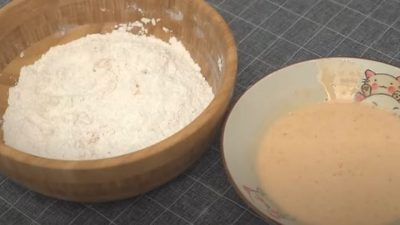 W dużej misce wymieszaj mąkę zwykłą, skrobię kukurydzianą, proszek do pieczenia, sól, suszony czosnek, mielone chili, suszoną cebulę i mielony czarny pieprz. Do drugiej miski wsyp połowę mąki, dodaj jajko i wodę. Następnie bardzo dokładnie wymieszaj mieszaninę.