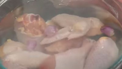 Umyj i oczyść kurczaka. Do miski wlać wodę, dodać sól, cukier i szalotkę. Wymieszaj mieszaninę i włóż do niej kurczaka. Następnie odstawiamy do marynowania na 6 godzin do lodówki.