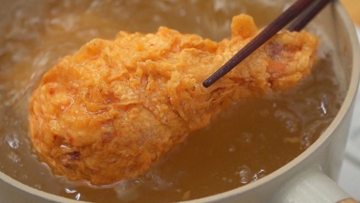 Kawałki kurczaka przełóż na papierowy ręcznik i osusz. Następnie najpierw ostrożnie obtaczaj je w mieszance jajecznej, a następnie w mące. Na głęboką patelnię wlać olej i rozgrzać go na średnim ogniu. Następnie ostrożnie włóż do niego panierowane kawałki kurczaka i smaż na złoty kolor i chrupkość, około 15 minut.