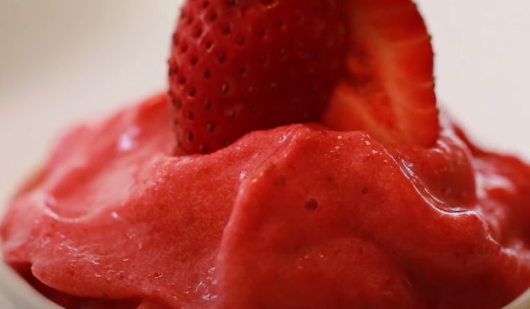 Weź truskawki i jogurt w proporcji 50:50 (ok. 70 g każdego produktu). Truskawki należy wcześniej zamrozić. Wymieszaj je z jogurtem, miodem (1 łyżka) i sokiem z cytryny (1,5 łyżki ) do uzyskania kremowej konsystencji. Wszystko gotowe! Pozostaje tylko włożyć je do zamrażarki w dowolnym pojemniku i pozostawić do zamrożenia (co najmniej 6 godzin, najlepiej na całą noc).