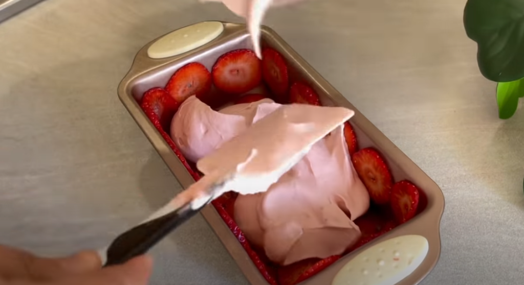 Zacznij od włożenia 250 gramów oczyszczonych i pokrojonych truskawek do małego garnka. Następnie posyp owoce cukrem granulowanym, skrop sokiem z cytryny i całość zagotuj. Po około dziesięciu minutach ciągłego mieszania zatrzymaj miksturę i wlej ją do blendera. Tutaj zmiel go na drobne puree. Następnie do miski wlać puree truskawkowe i w kolejnym kroku ubić śmietanę na sztywną pianę. Do smaku także cukier puder i na koniec jogurt truskawkowy zmieszany z puree truskawkowym.