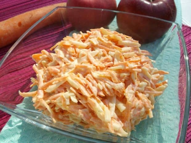 Marchewkę zetrzyj na tarce o dużych oczkach i dodaj do niej drobno pokrojone jajka. Czosnek przeciśnij przez praskę i wymieszaj ze śmietaną. Całość połącz doprawiając solą i ulubionymi ziołami. Możesz także dodać por, szczypiorek lub tarte jabłka dla różnorodności smaków. Ta sałatka oferuje wiele wyśmienitych wariantów.