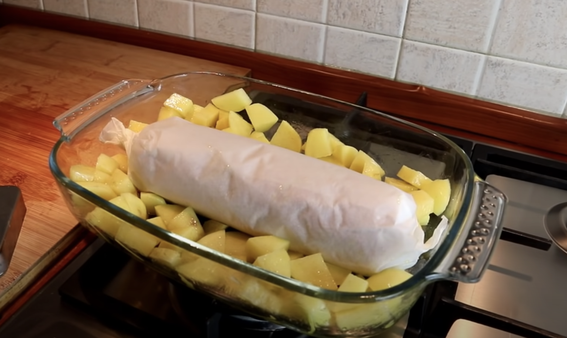 Ziemniaki obrać i pokroić w kostkę, umieścić w naczyniu, polać olejem, na wierzchu położyć roladę.