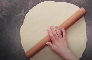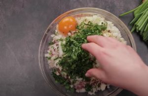Przenieś ciasto na oprószony mąką wałek i rozwałkuj na grubszą płaską płytę o kształcie kwadratu. W misce umieść mięso mielone. Dodaj starty ser twardy, drobno posiekaną cebulę, jajko, sól, pieprz, posiekaną pietruszkę i majeranek. Wszystko dokładnie wymieszaj.