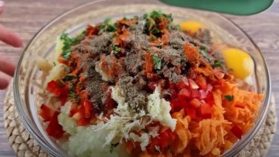 Włóż mięso mielone do miski. Zetrzyj ziemniaki, odciśnij z nich wodę i dodaj do mięsa. Następnie dodać do niego grubo startą cebulę i marchewkę. Dodać pokrojoną w kostkę paprykę, posiekaną natkę pietruszki i koperek, 2 jajka, mieloną słodką paprykę oraz sól i pieprz do smaku.