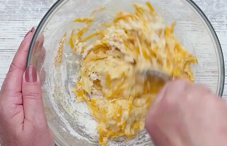 Zetrzyj obraną dynię na grubej tarce, do powstałej masy dodaj jajka, mąkę, kaszę mannę, sól i czarny pieprz. Wszystko dokładnie wymieszaj.