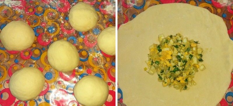 Wymieszaj sodę z kefirem. Dodaj łyżeczkę soli i cukru, wymieszaj. Zacznij dodawać mąkę porcjami. Zagnieć miękkie, lepkie ciasto. Aby przygotować nadzienie grubo posiekaj ugotowane wcześniej na twardo jajka. Drobno pokrój cebulę i podsmaż na mieszance oleju roślinnego i masła.