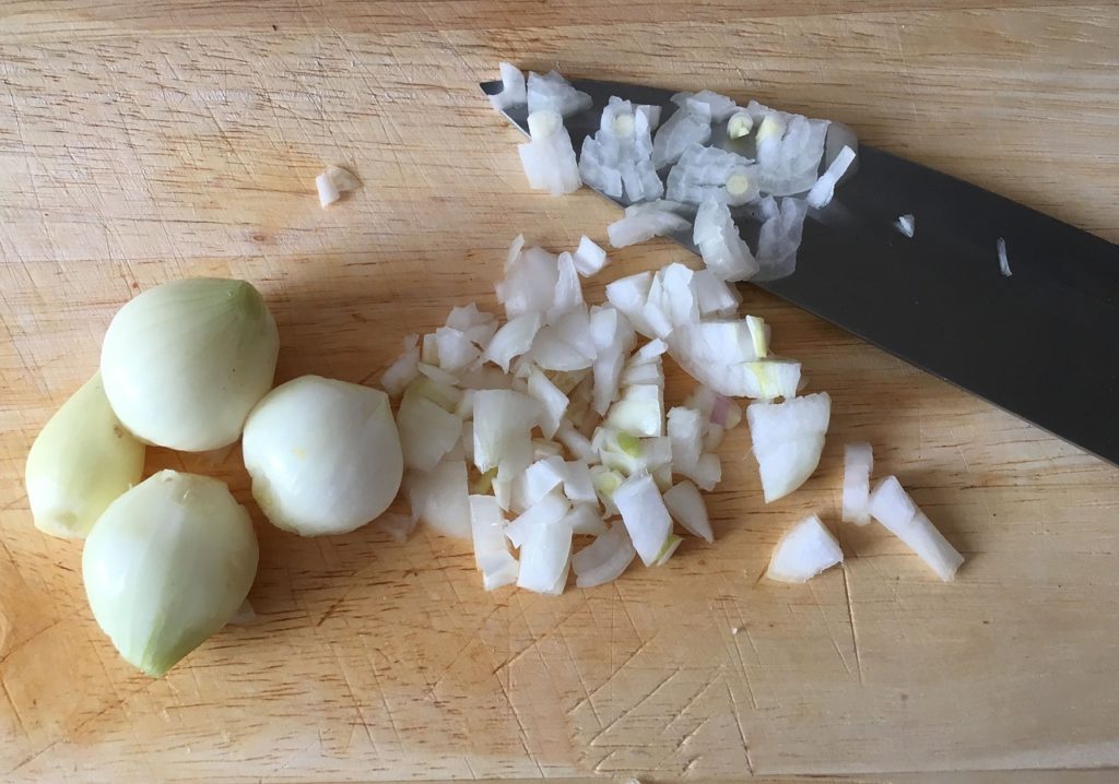 Do garnka wlej olej słonecznikowy i podgrzej. Dodaj drobno posiekaną cebulę.