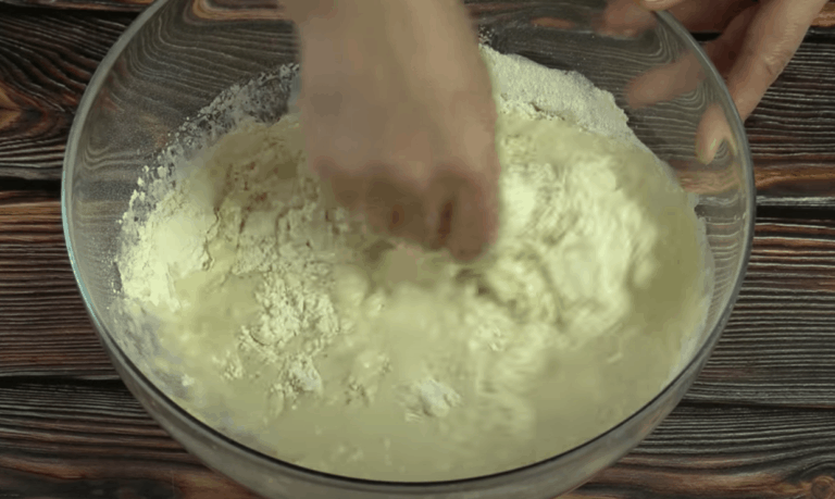 Wlej około 350 ml kefiru i dobrze wymieszaj. Jeśli ciasto jest zbyt gęste, dodaj trochę więcej kefiru i uformuj je w kulkę. Ciasto możesz (ale nie musisz) odstawić na około 30 minut.
