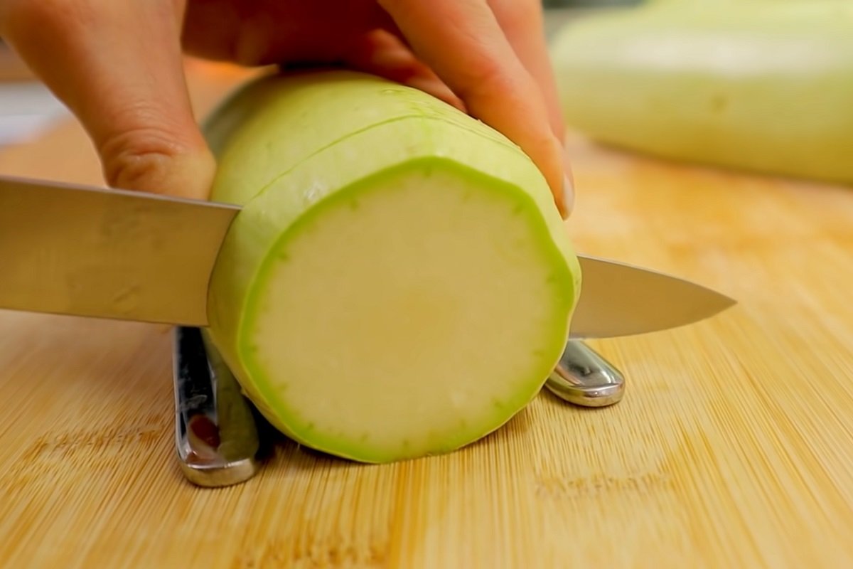 Umyj cukinię, odetnij brzegi z przodu i z tyłu i delikatnie jeden pasek z boku (aby można było położyć warzywo, aby się nie obracało). Pokrój każdą cukinię w paski, nie przecinając jej jednak do końca.