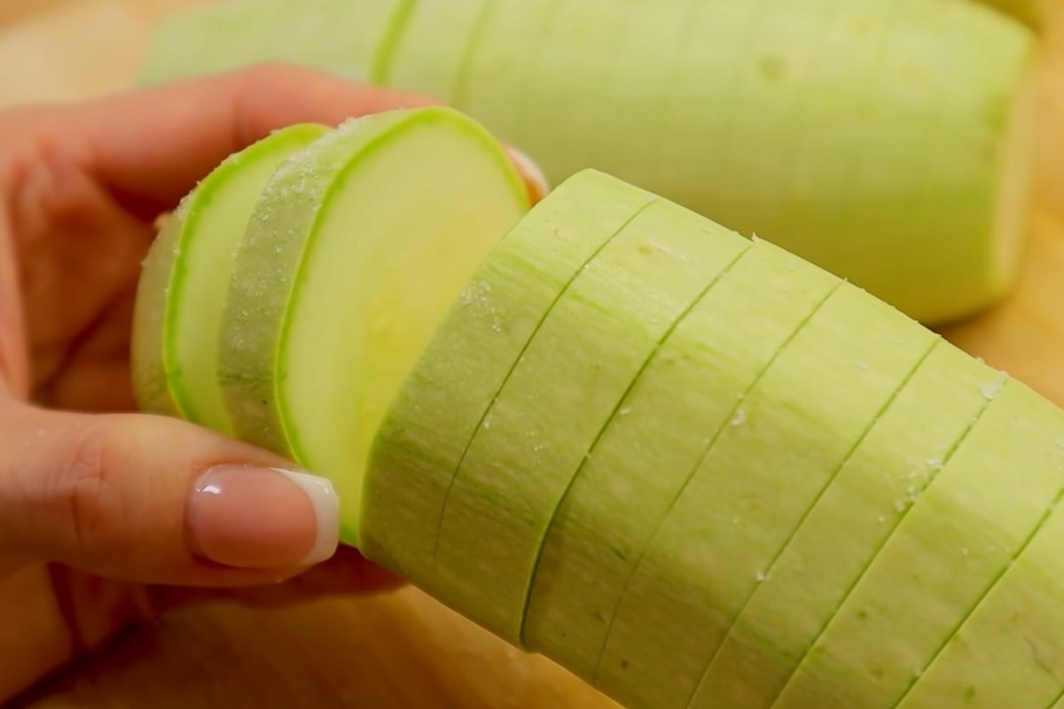 Posyp cukinię solą na wierzchu i między nacięciami. Odstaw na 15 minut.