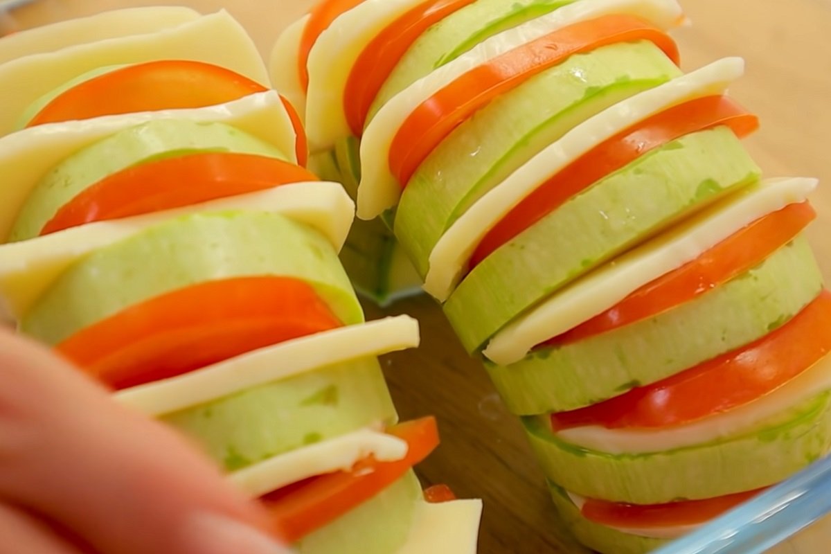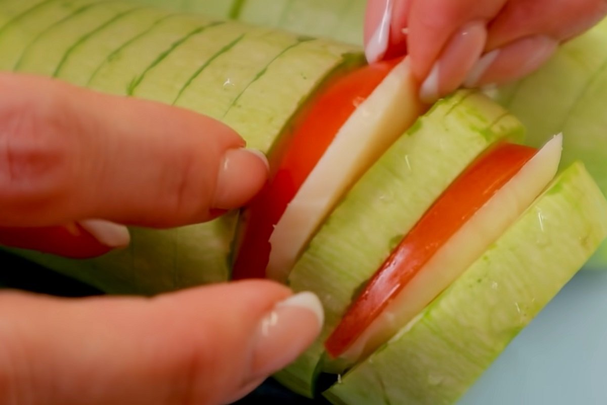W tym czasie pokrój pomidory w półpierścienie, a ser w cienkie plasterki. Następnie włóż plaster pomidora i plaster sera między każde przecięcie cukinii.
