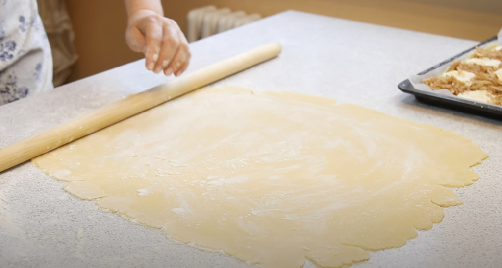 Rozwałkować na stolnicy drugą połowę ciasta i ostrożnie przełożyć na nadzienie. Jeżeli ciasto wystaje po za krawędzie formy, obciąć nożem brzegi i ułożyć na górze ciasta.