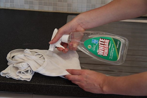Nie musisz wiedzieć, w jaki sposób powstała dana plama. Biały ocet poradzi sobie ze zdecydowaną większością z nich. Spryskaj plamy octem i pozostaw na 10-15 minut. Łagodne plamy można wymoczyć w mieszaninie octu i ciepłej wody w stosunku 1:2. Po praniu plamy powinny zniknąć.