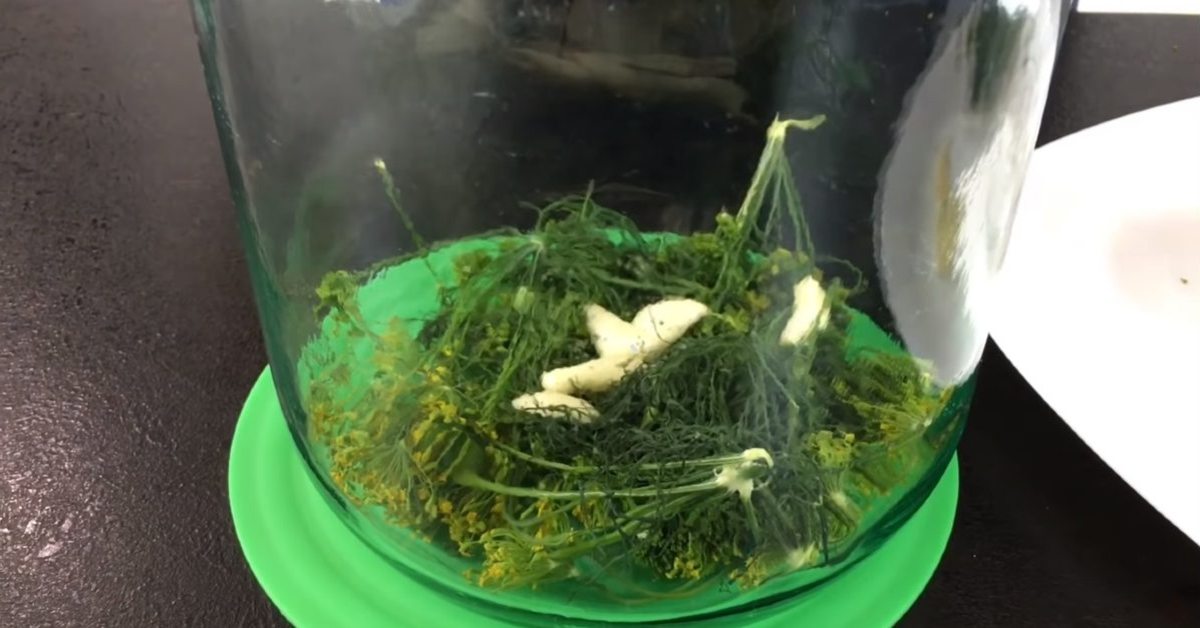 Ogórki dokładnie umyj w wodzie. Następnie zalej je wodą i pozostaw do namoczenia na godzinę. Odlej wodę i odetnij końce wszystkim ogórkom, co sprawi że proces marynowania lepiej przebiegnie. Przygotuj słoik. Obierz ząbki czosnku i włóż je na dno słoika. (Jeśli są duże, możesz je przekroić na pół) Dodaj też koper. (odkładając na bok dwa baldachy)