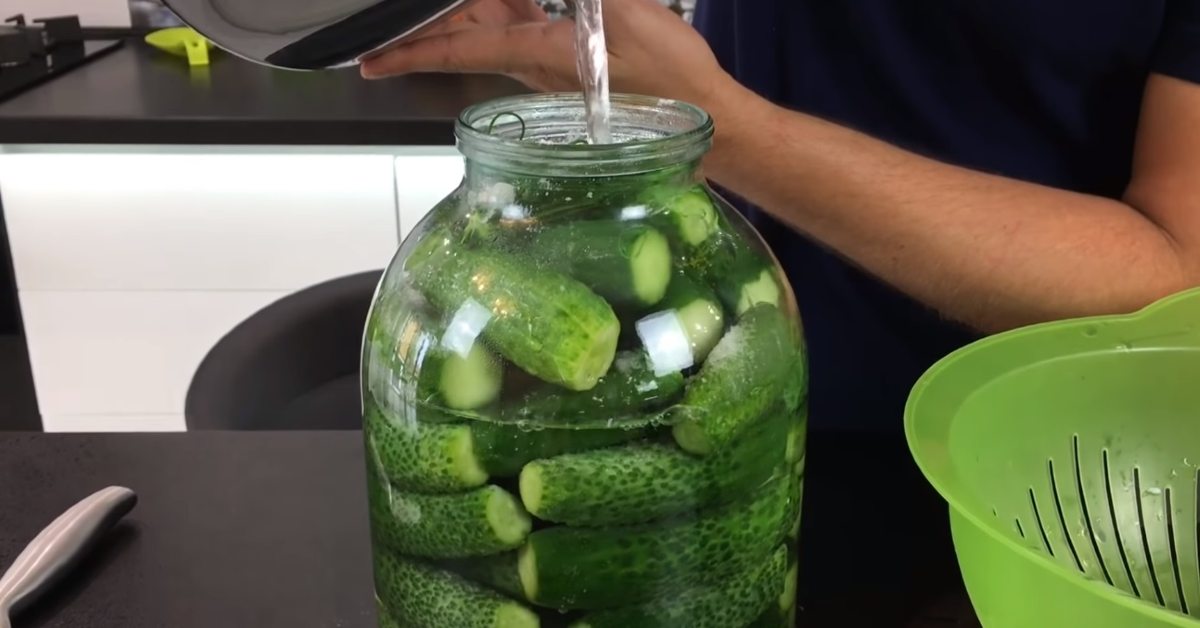 Następnie posyp solą zawartość słoika. Zagotuj wodę i zalej nią ogórki. Słoik zakręć szczelnie pokrywką i lekko parę razy przechyl, by sól się dobrze wymieszała. Jak tylko woda już ostygnie, włóż słoik do lodówki na całą noc.