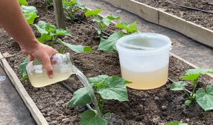 Kiedy fermentacja dobiegnie końca, połącz jedną filiżankę z 10 litrami wody i podlej każdą roślinę.