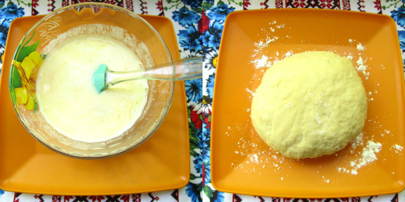W głębokim naczyniu wymieszaj jajka z solą oraz z cukrem zwykłym i waniliowym. Dodaj kefir i olej słonecznikowy, a następnie ponownie zamieszaj. Przesianą przez sitko mąkę z dodatkiem proszku do pieczenia połącz z resztą składników i zagnieć ciasto. Będzie gotowe, gdy przestanie się lepić do rąk.