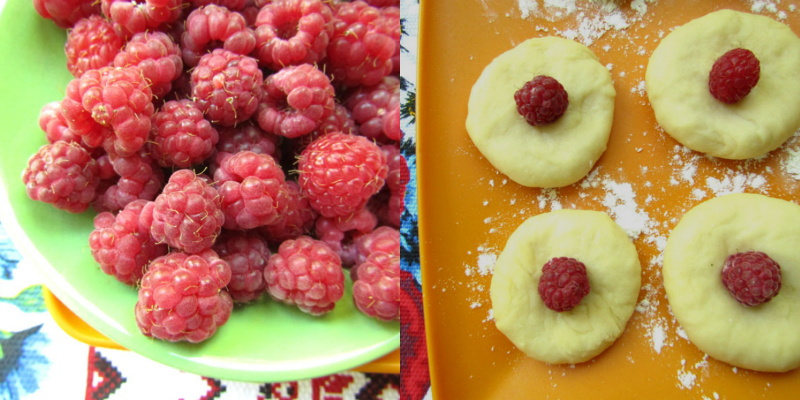 Następnie rozwałkuj ciasto i pokrój na kawałki. Ręką uklep je, aby uzyskały płaski kształt i połóż na środku maliny. Na koniec połącz krawędzie i stwórz niewielką kulkę.