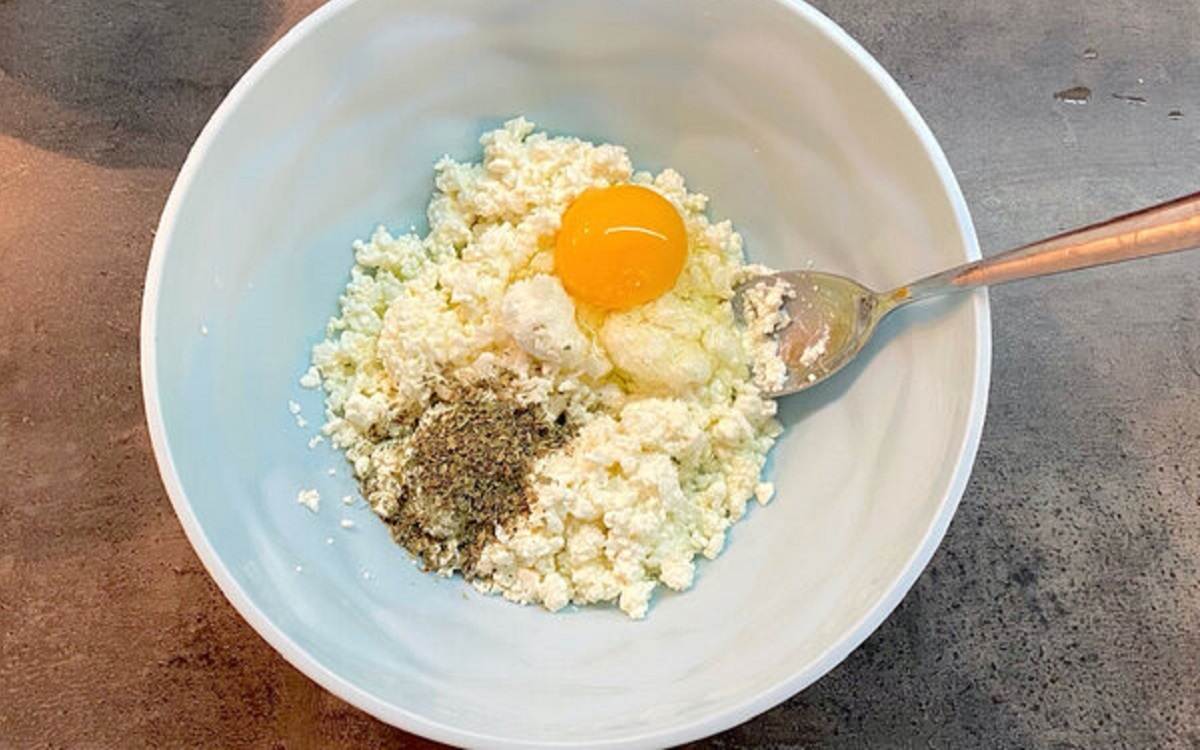 Wymieszaj twaróg, jajko i zioła prowansalskie.