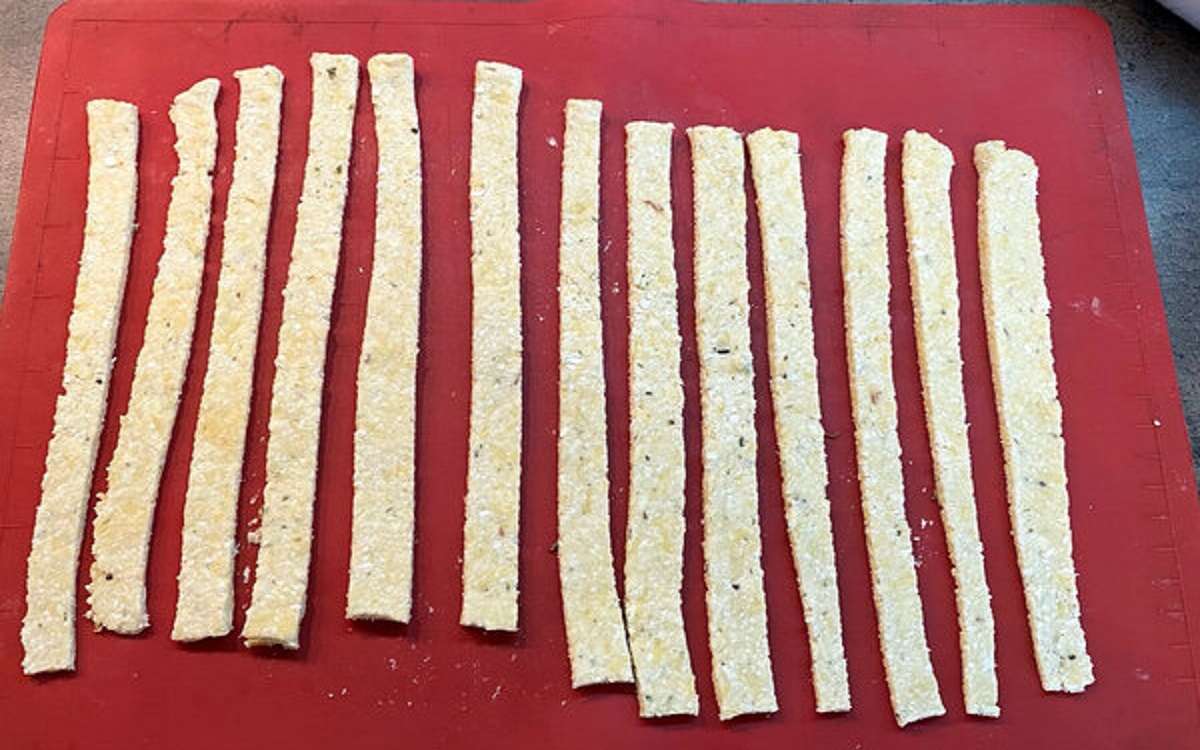 Rozwałkuj schłodzone ciasto i pokrój w paski. Piecz w piekarniku nagrzanym do 200°C przez ok. 25 minut.